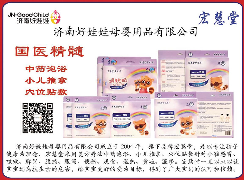 濟南好娃娃母嬰用品有限公司成立于2004年,旗下品牌宏慧堂,是以專注孩子健康理念,宏慧堂采用復方療法中藥泡浴、小兒推拿。穴位貼敷針對小兒感冒、咳嗽、脾胃、腹痛、腹瀉、便秘、厭食、退熱、黃疸、濕疹。宏慧堂一直以來以讓寶寶遠離抗生素的危害,為寶寶更好的愛為目標,得到了廣大寶媽的認可和信賴!